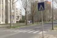 Gyalogátkelő a Váci utcában. Tábla is jelzi a zebrát. Nappal nem nehéz észrevenni és vélemények szerint este is jó a megvilágítása.