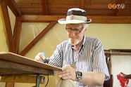 Gothard Jenő fivérének, Istvánnak a mellszobra készül hársfából éppen. A motorfűrészt később, az arc megformálásánál finomabb kézi eszközök váltják fel. Ez a pirográfia pedig a herényi templomot ábrázolja majd.