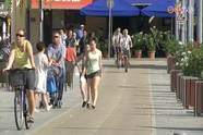 A Fő téren átvezető kerékpárúton egymást érik a biciklisek. Ez az egyik csomópont, ahonnan több irányba vezetnek tovább az utak.