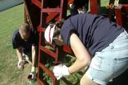 Új festést kapnak a játékok a nardai plébániakert játszóterén. A Szombathelyi Egyházmegyei Karitasz már készül a táborozók fogadására.