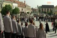 Díszmenetben érkeztek laktanyájukból a kőszegi Fő térre az önkéntes tűzoltóság tagjai.