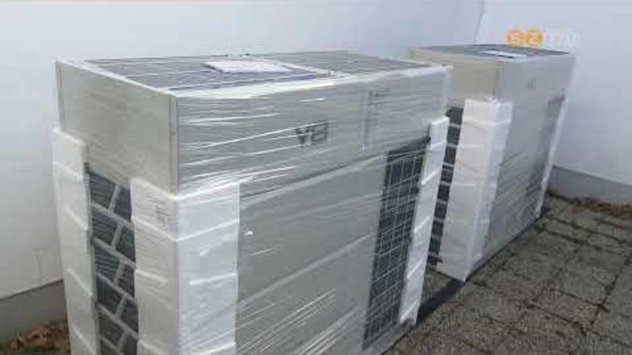 Daruval emelték a helyükre a klímaberendezés kültéri egységeit ma délelőtt a sportháznál. A lapostetőn helyezték el a három nagyméretű berendezést - egyelőre becsomagolva várják, hogy megérkezzen a többi szükséges alkatrész, és elkezdődhessen a szerelési munka. A nagyteremben eddig nem volt légkondicionáló, a nyári hónapokban ezt érezték is a látogatók, jócskán átmelegedett a helyiség. Ezt a hiányt pótolja a mostani beruházás.
