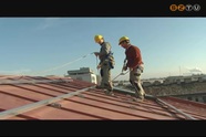 A napelemeket tartó konzolokat szerelik éppen a könyvtár tetőszerkezetén a kivitelező cég munkatársai. Több mint 14 millió forintból 42 darab folyadékkristályos napelem kerül majd ide. Az intézmény jelentős megtakarítást remél a fejlesztéstől.
